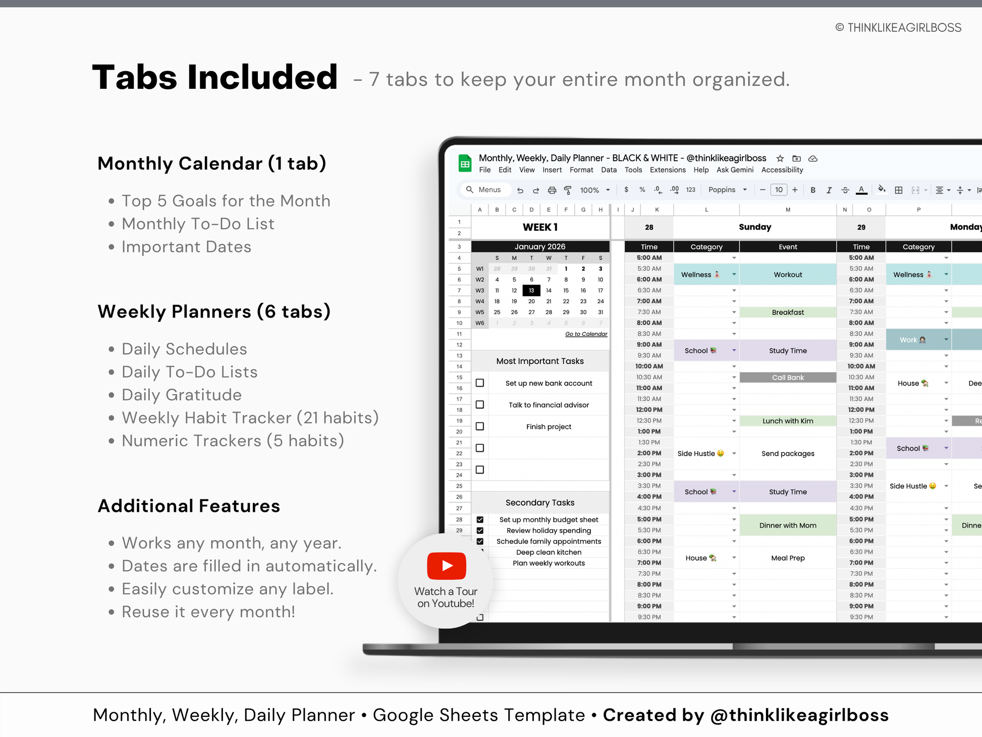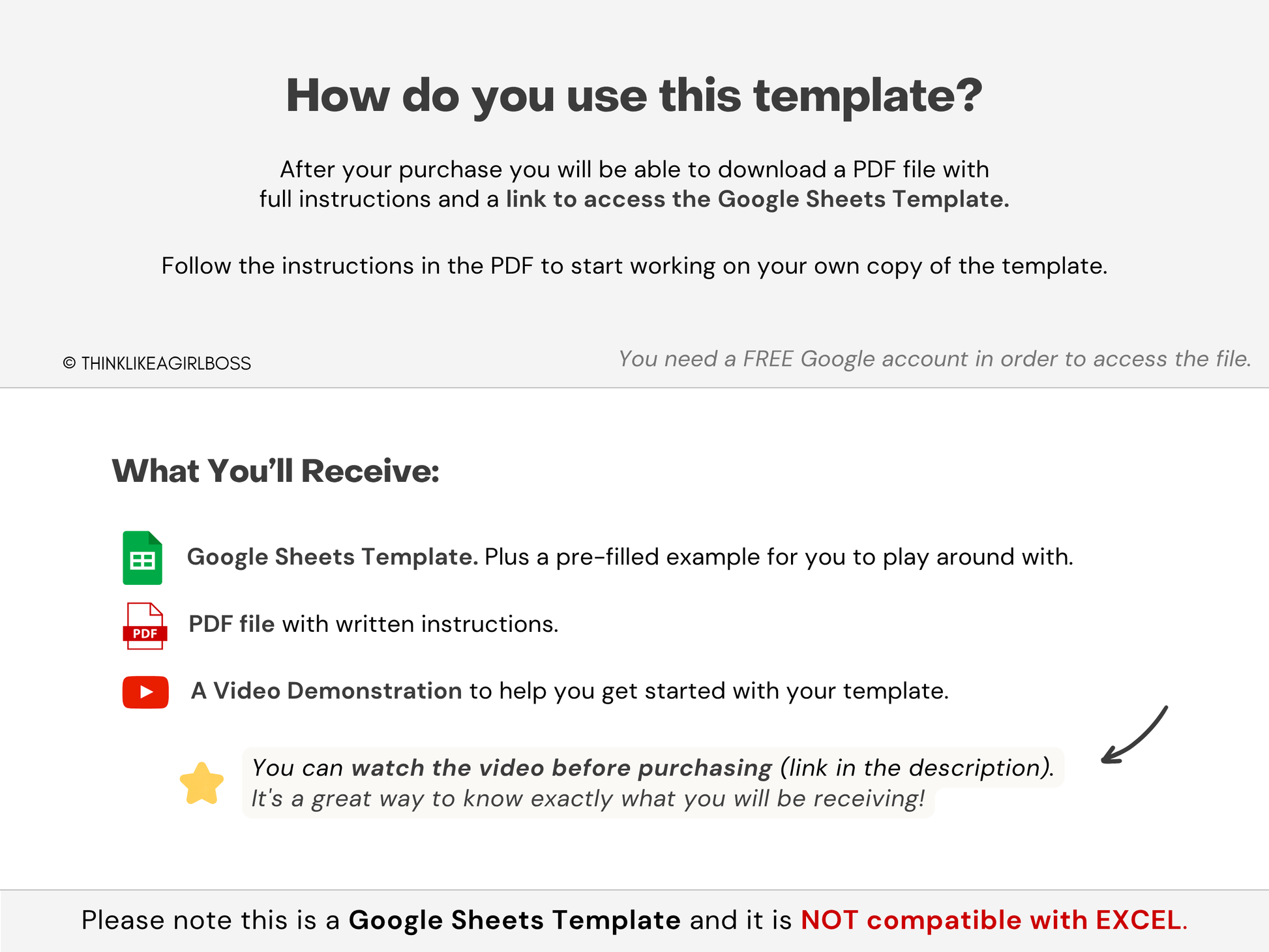 - Please note this template is NOT compatible with Excel, it can ONLY be used with Google Sheets.