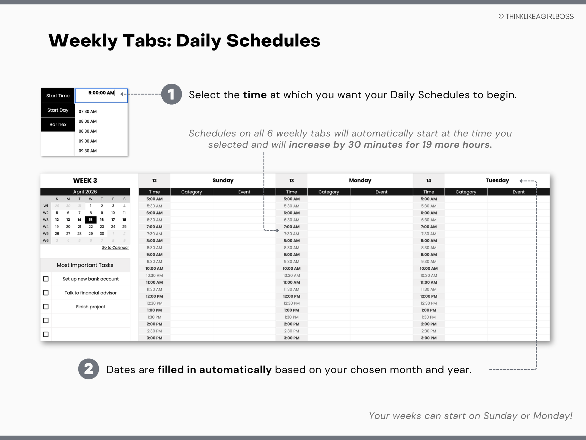 Step 3: Use the 6 Weekly tabs to plan your daily schedules, create daily to-do lists, and keep track of your habits.