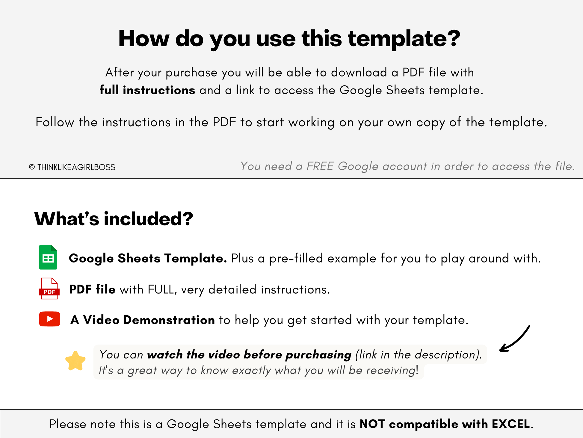 - Please note this template is NOT compatible with Excel, it can ONLY be used with Google Sheets.