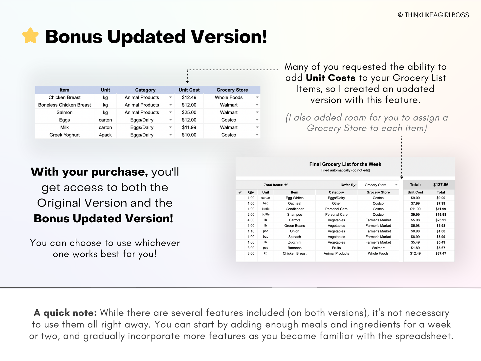 Customize the template with your own Items and Meals and watch as your grocery lists are created automatically!