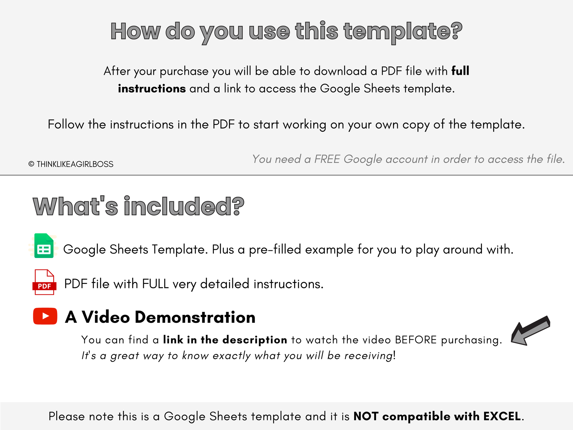 - Please note this template is NOT compatible with Excel, it can ONLY be used with Google Sheets.