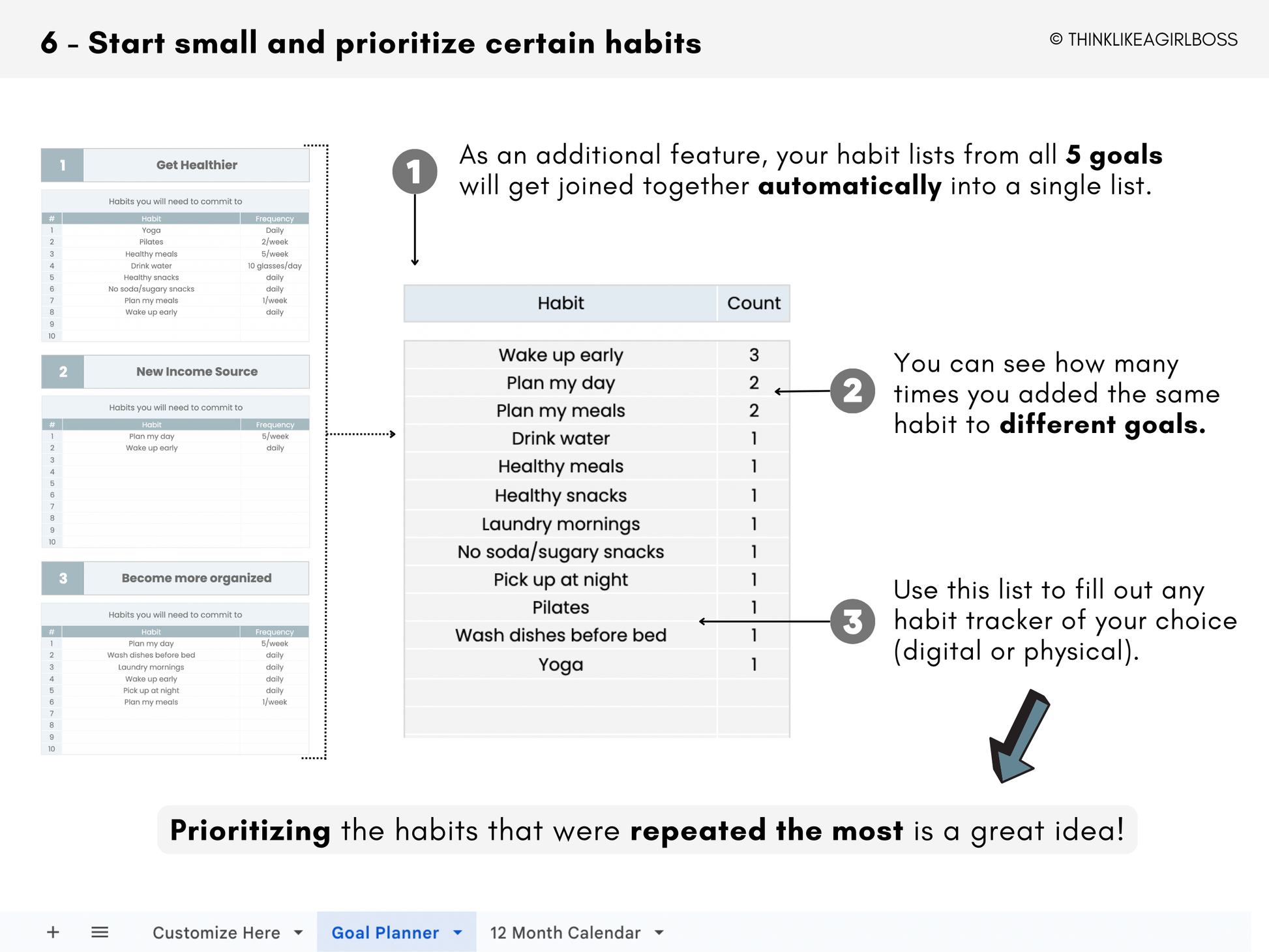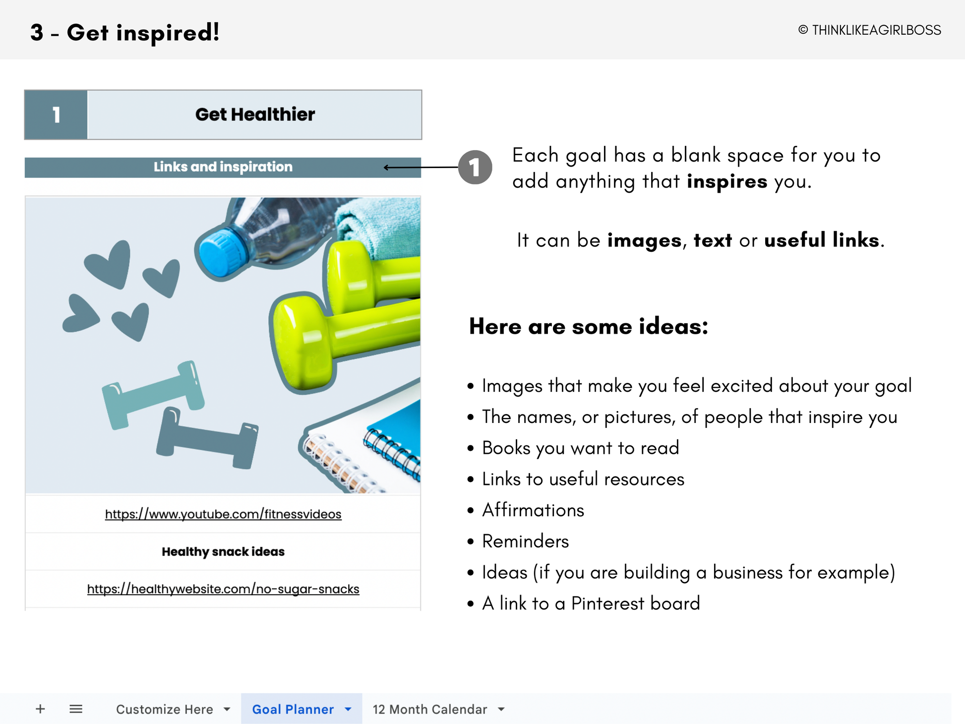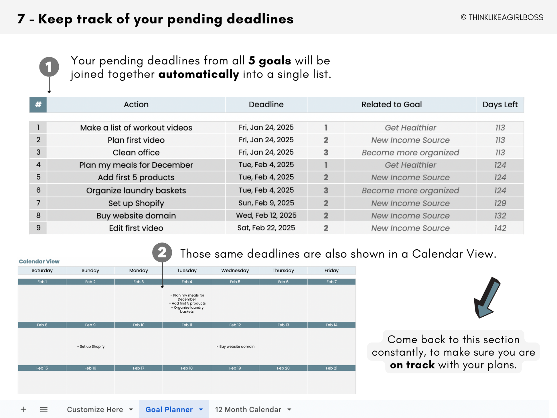 This Digital Goal Planner Template is not tied to any specific period of time. You can start whenever you want and work on up to 5 goals at a time.